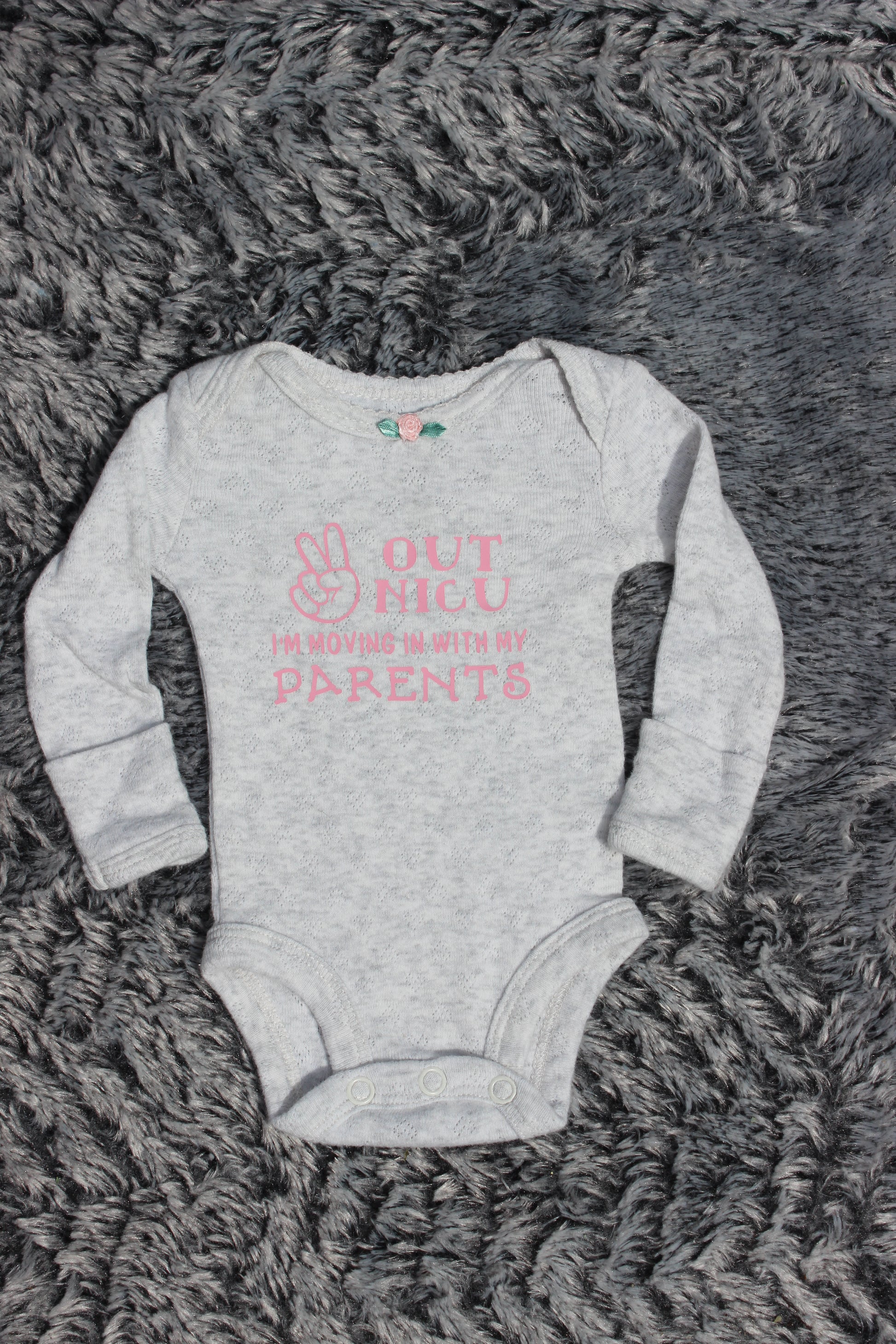 A long sleeve infant onesie with a heat transfer vinyl design.
